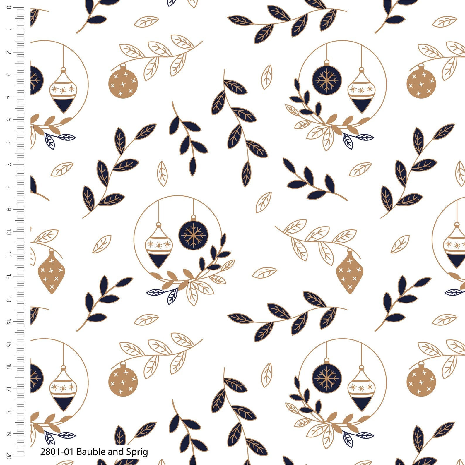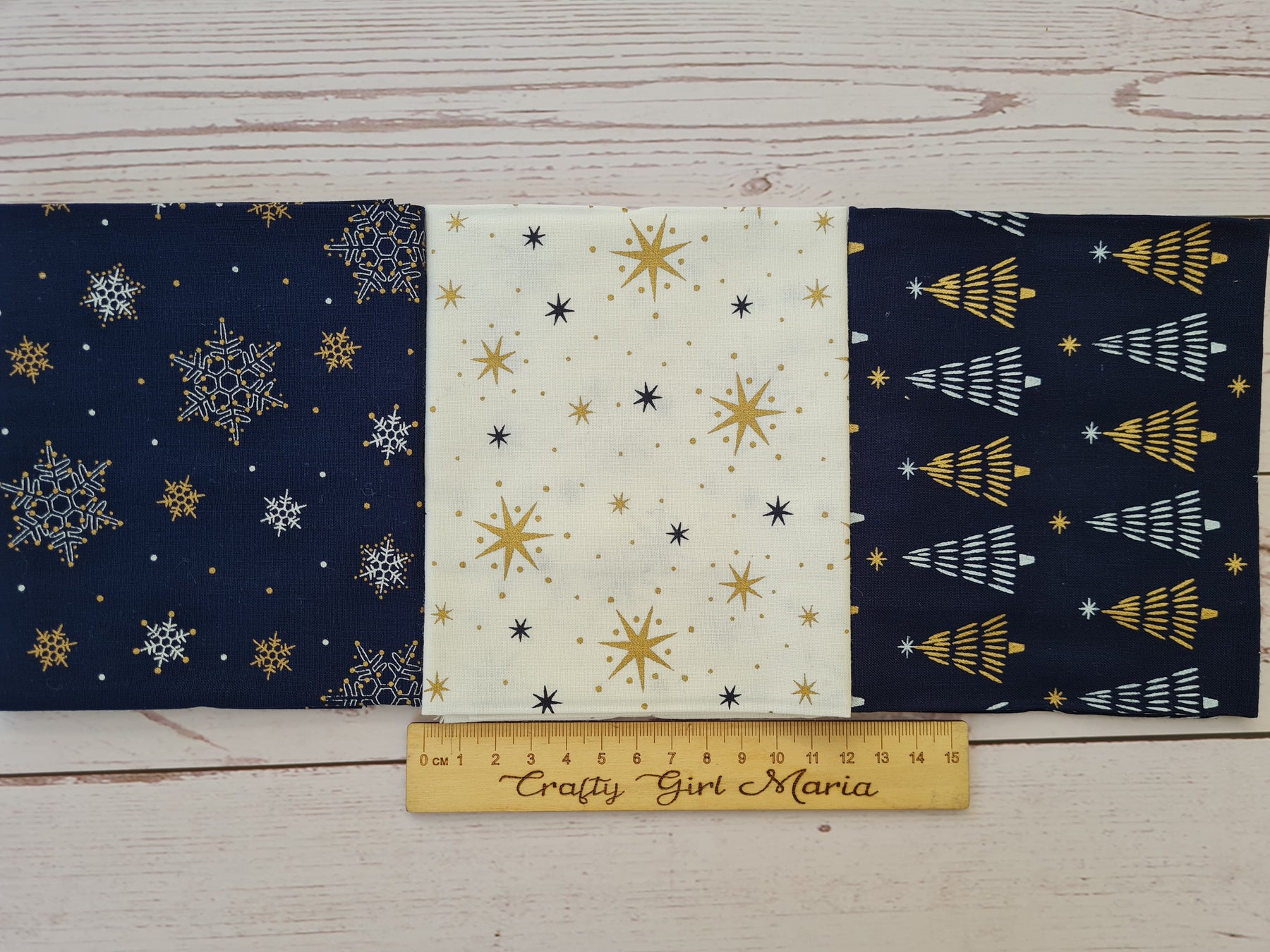 Christmas fat quarter bundle: "Gold Metallic"  - a beautiful set of five fabrics designed by the Craft Cotton Company. Featuring navy and gold baubles, stars, Christmas fir trees, mistletoe, snowflakes and vines.