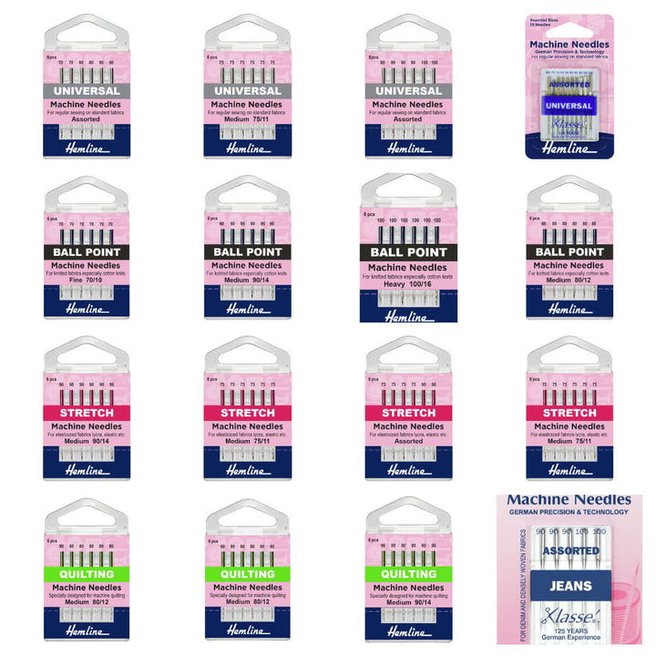 Hemline sewing machine needles x 5/6/10. Ballpoint, Stretch, Universal, Jeans, Quilt.