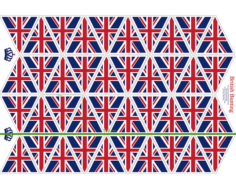 This very popular, make your own bunting fabric features 20 flags on each panel with 1cm seam allowance around each piece to make 10 double sided bunting flags.