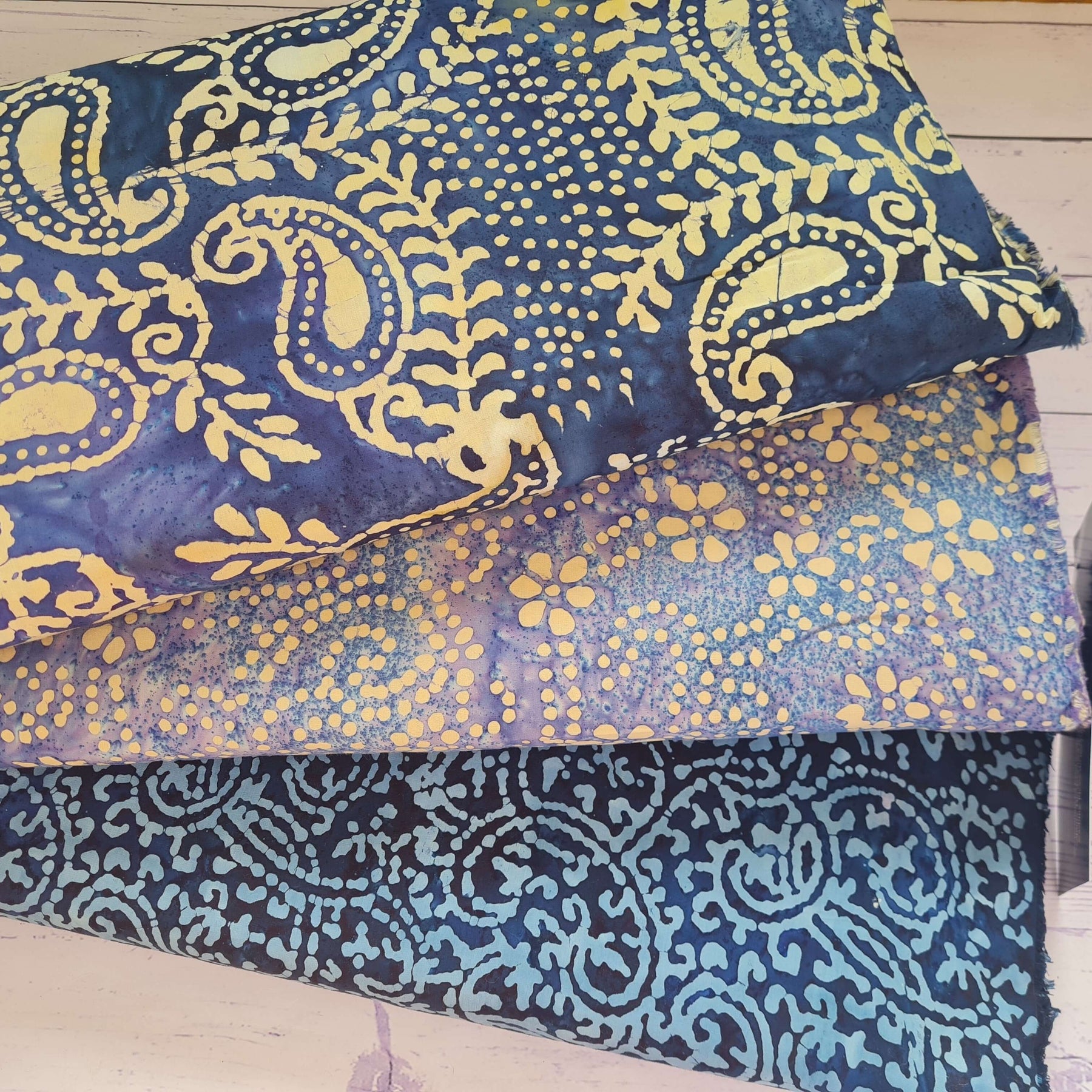 A stunning range of distinctive cotton batiks in blue colours, hand-printed in a unique cottage industry by specialist craftsmen who have been passing their skills down for generations.