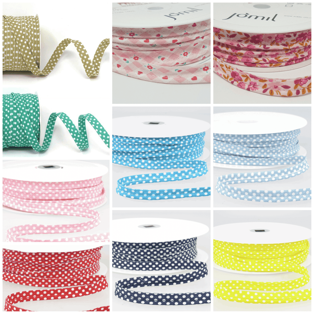Patterned flanged 10mm wide piping cord trim 2 mm. Floral and polkadot trim. Per Metre