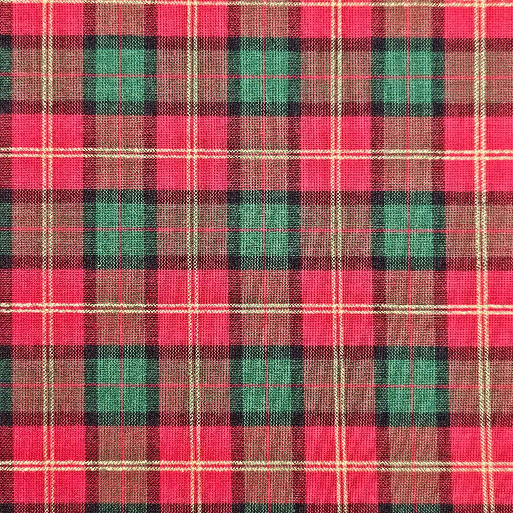Tartan/Plaid Cotton fabric available in red and green with a metallic gold thread.