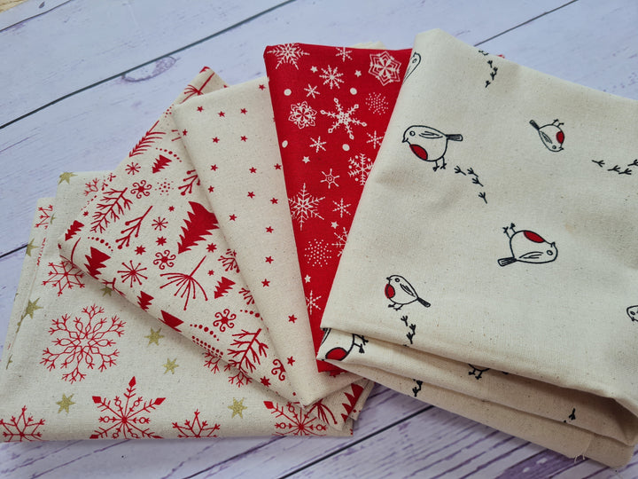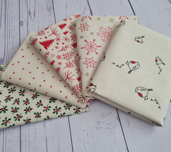 Five fat quarters of Christmas-themed fabric in red, green, metallic gold and cream