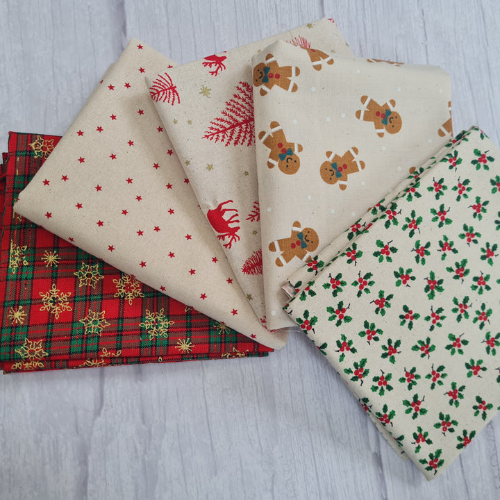 Five festive fabric fat quarters with Christmas patterns featuring gingerbread man